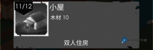 小屋需要使用10木材进行建造。工人可以在小屋中进行休息,恢复精力。没有小屋居住的工人将在篝火旁进行休息,在篝火旁休息的工人精力不会得到恢复,还可能遭受夜晚怪物的袭击,在小屋中休息可以躲避怪物袭击。建造足够的小屋有助于减少工人损失,小屋后续可以升级,一个小屋最多只能居住5人。