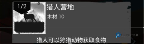 猎人营地需要使用10木材进行建造。猎人营地中最多可以设置两位猎人。猎人会进行狩猎获取食物,是早期食物的重要来源。猎人营地可以用来储存食物和皮毛,食物可以为工人提供能量,皮毛可以制作成皮革,也可以用于一些建筑的升级,猎人营地用于储存食物与皮毛资源,一旦物品储存满了,玩家可以升级猎人营地,最高可升至3级。