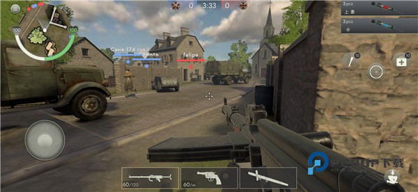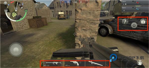 4、屏幕下方代表可以切换的武器,右边有手榴弹以及治疗包,玩家可以合理的运用这些武器
