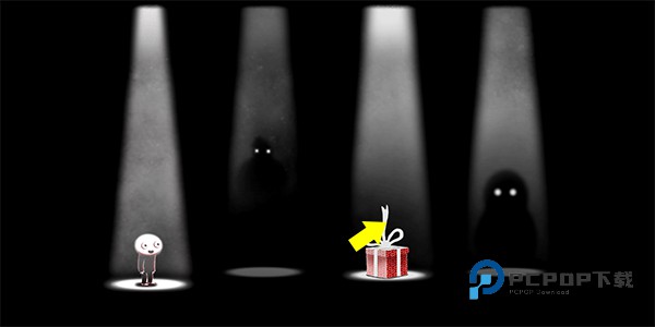 3、往右边走,在一众黑白的世界中,我们能很明显地看到一个色彩鲜艳的礼物盒