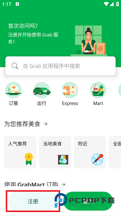 1、在Grab主界面,点击底部的注册按钮,进入注册流程的初始页面。
