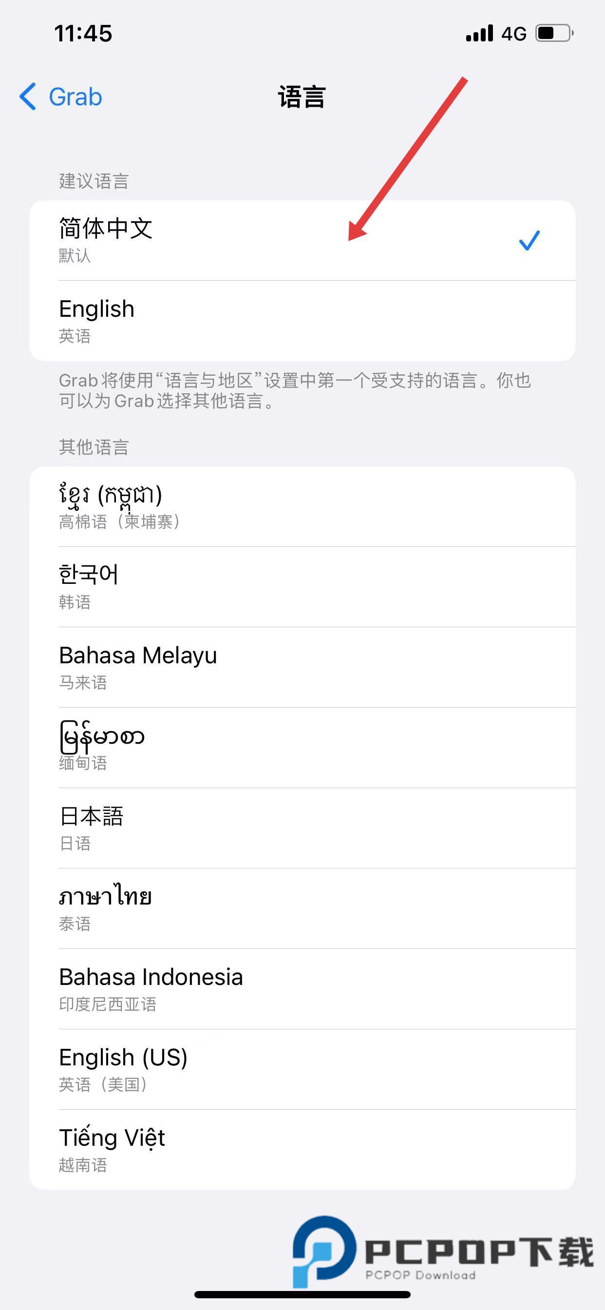 4、查找并选择简体中文,确认更改,应用界面将自动更新为中文显示。