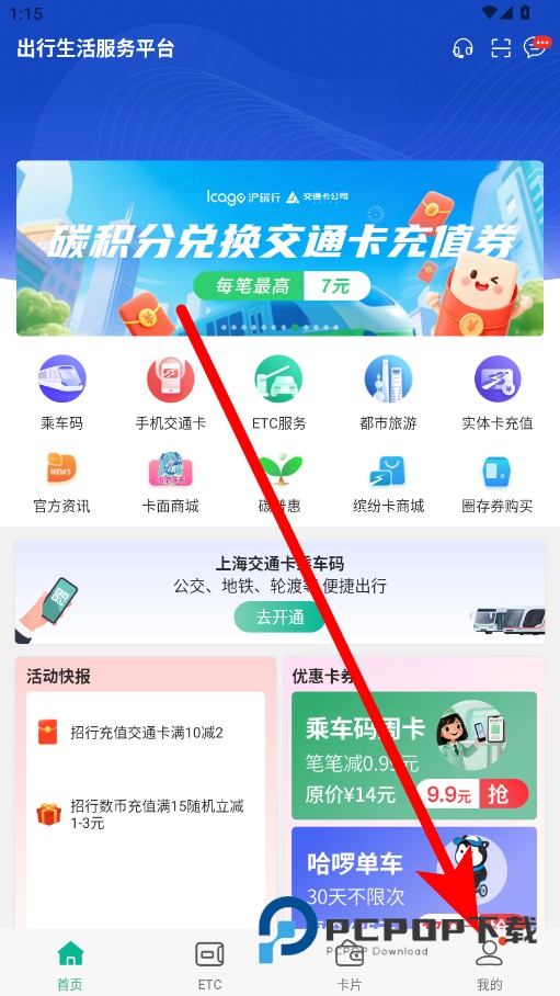 1、进入上海交通卡app后,点击底部我的选项,进入个人页面。