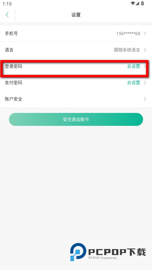 3、在设置界面,点击登录密码后的去设置选项,进入密码设置页。