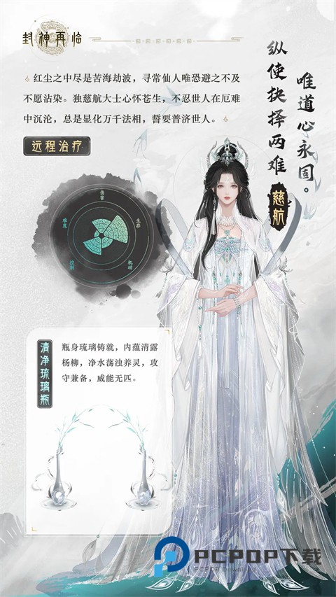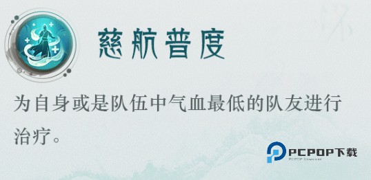二技能:慈航普度:为自身或是队伍中气血最低的队友进行治疗。