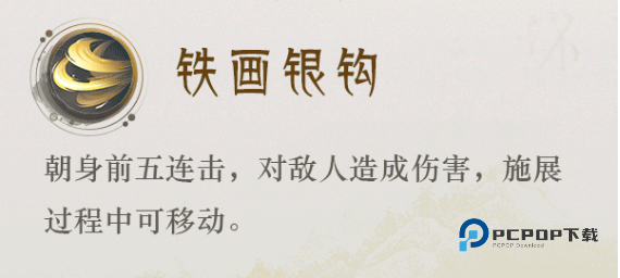 一技能:铁画银钩:朝身前五连击,对敌人造成伤害,施展过程中可移动。
