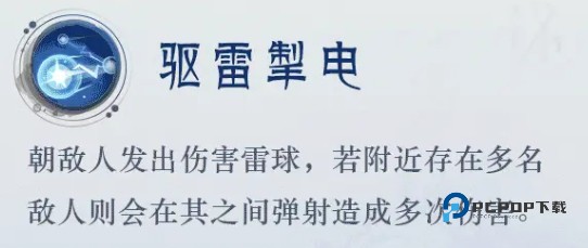 二技能:驱雷掣电:朝敌人发出伤害雷球,若附近存在多名敌人则会在其之间弹射造成多次伤害。