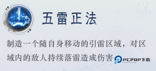 三技能:五雷正法:制造一个随自身移动的引雷区域,对区域内的敌人持续落雷造成伤害。