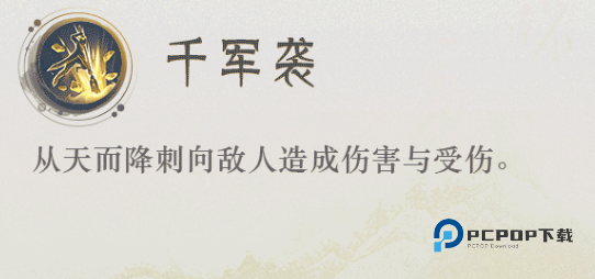 二技能:千军袭:从天而降刺向敌人造成伤害与受伤。