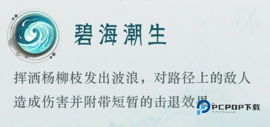 一技能:碧海潮生:挥洒杨柳枝发出波浪,对路径上的敌人造成伤害并附带短暂的击退效果。