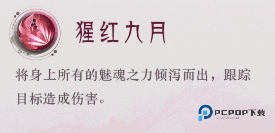 三技能:猩红九月:将身上所有的魅魂之力倾泻而出,跟踪目标造成伤害。
