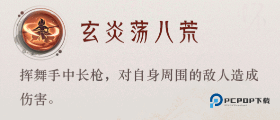 四技能:玄炎荡八荒:挥舞手中长,对自身周围的敌人造成伤害。