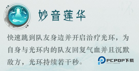 四技能:妙音莲华:快速跳到队友身边并开启治疗光环,为自身与光环内的队友回复气血并且沉默敌方,光环持续若干秒。