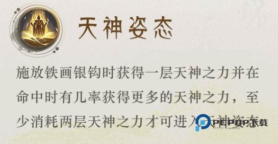 四技能:天神姿态:施放铁画银钩时获得一层天神之力并在命中时有几率获得更多的天神之力,至少消耗两层天神之力才可进入天神姿态。