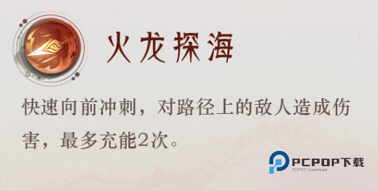 1技能:火龙探海:快速向前冲刺,对路径上的敌人造成伤害,最多充能两次。