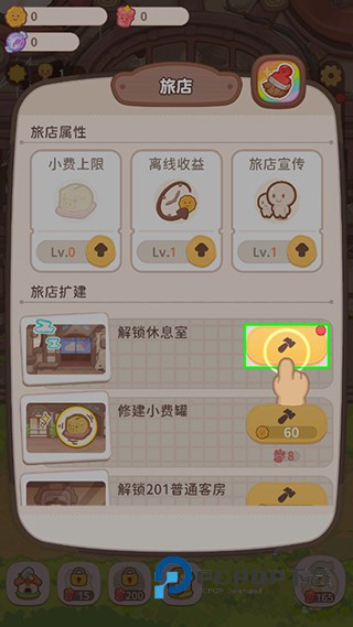 1、玩家在人气值达到500之后就可以解锁阁楼,再首页点击旅馆最上方的房屋,即可进入阁楼。