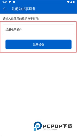 5、进入注册为共享设备页面之后,输入组织电子邮件后点注册设备。