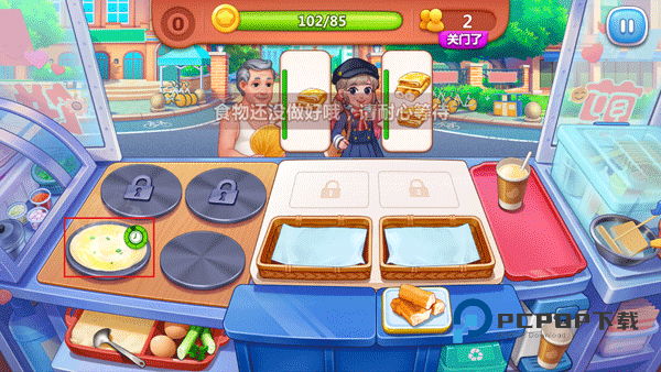 3、在做煎饼时,右上角的绿色圆圈表示它快要成熟的时间,如果变成了红色圆圈,就表示快要烧焦的时间。只要在它立马变成红色圆圈时那个客人即可。只要每天赚到一定数量的金币就可以关门啦!