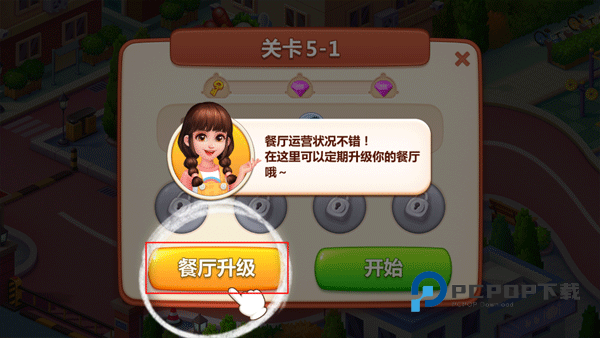 4、玩家在进入到关卡5-1时,会自动解锁餐厅升级功能,点击它。你以用赚到的金币购买食材,解锁新的厨具。