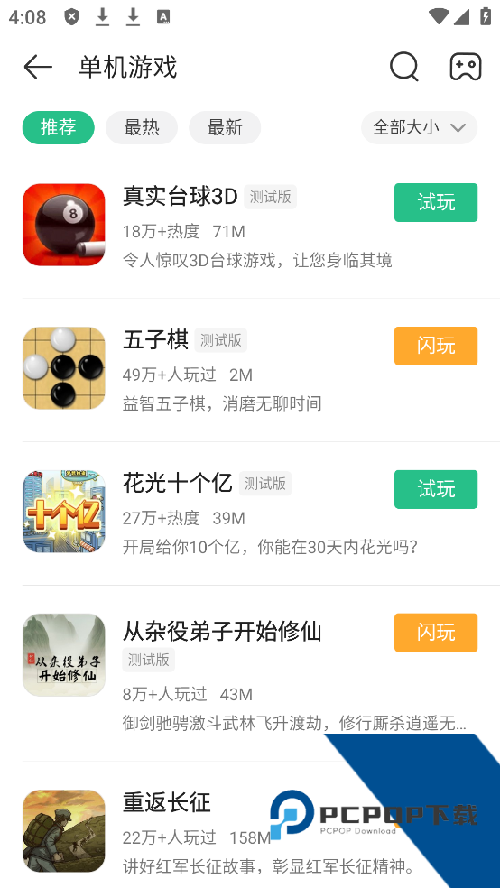 3、选择你自己喜欢的,点击试玩,就会下载到手机上,下载好就可以开始游玩了;