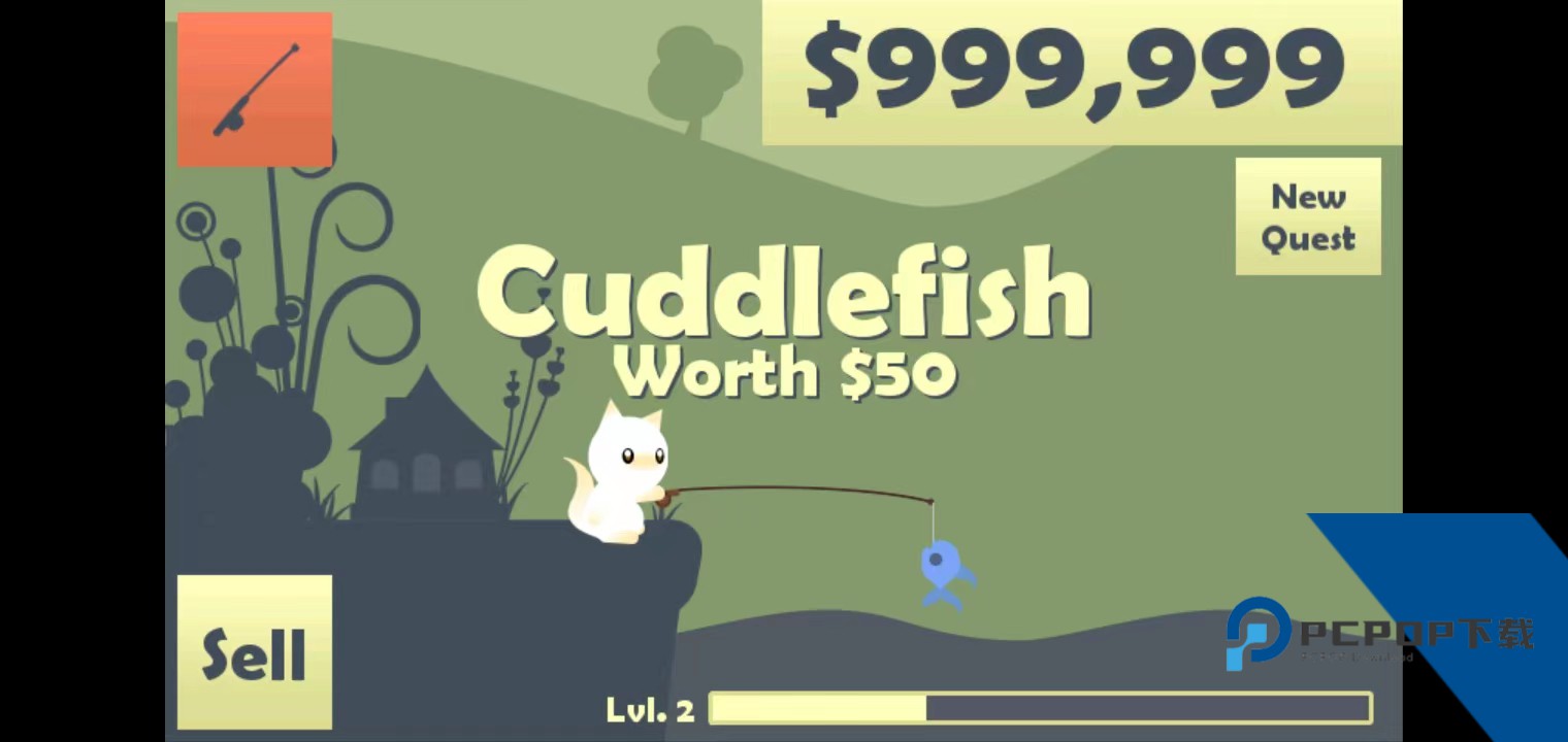 2、钓到鱼后,长按手机屏幕,就可以把鱼钓上来,钓到鱼的话则会获得大量金币,点击左下角的【sell】出售可获得金币;