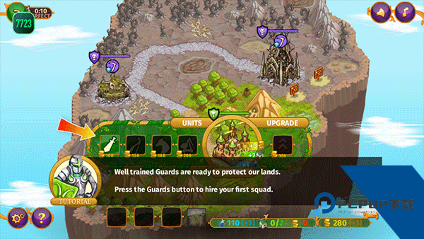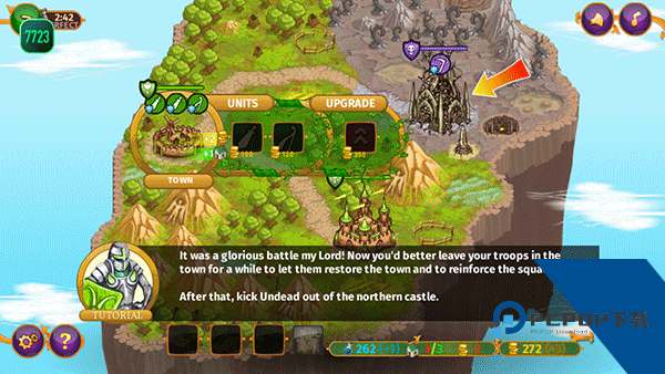 3、过关后能对各种兵种进行升级。点击基地或兵营,然后点击UPGRADE能进行升级。点击左下角的箭头能加速进行游戏;