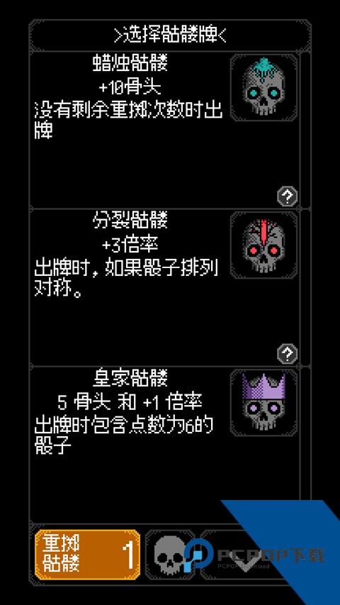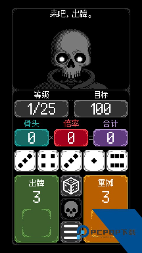 3、玩骰子组合: 每组合尽量激活尽可能多的骷髅,通过重掷获得一切优势。强化成功的组合,增强你的牌组应对日益严峻的挑战。