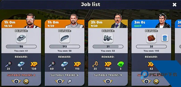 游戏为您提供任务,或者称之为“工作”。基本上你必须向他们提供一定数量的某种商品。没有时间限制,但有些工作需要某种类型的机车。您可以在上面的屏幕截图中看到,一些工作没有“合适的火车”,这意味着我没有任何合适类型的免费机车(史诗)。