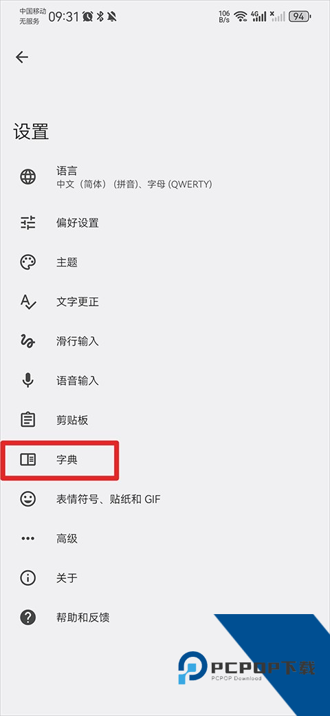 2、正在设置界面中点击字典功能。