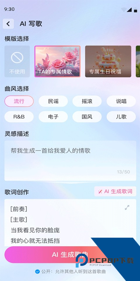 3、AI写歌:输入一句话,AI一键生成你的专属音乐;