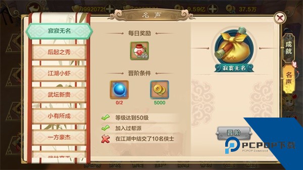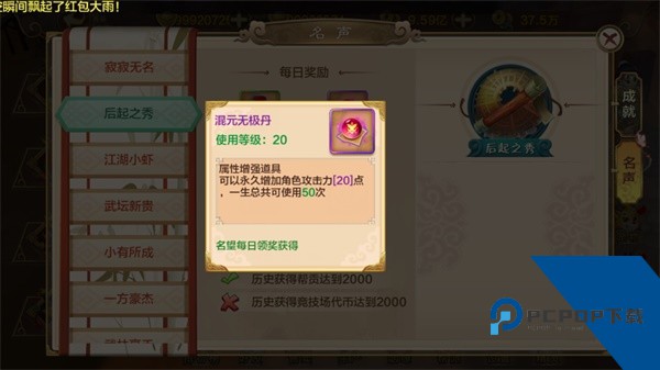 在【热江】手游版中,同过参加各种活动及等级提升,获得各种资源和积分可以获得名声,名声越大获得的每日物品越好,其中还有三种丹药可以永久提高角色属性。