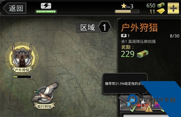 ps:升级倾向-比较主张先升级支的稳定性和放大倍率,为什么这么说呢?因为游戏前期还只是让你射杀动物的肺,但后期会让你射杀心脏。心脏位于肺的下方,与肺相比只有很小一块,光是瞄准就很不容易了。后面还有更恶心的要你射杀两头动物的心脏,假如你无法迅速瞄准的话,碰运气是无法完成这样的任务的。