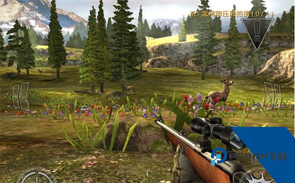 6、先打距离最近的,这样威力大,瞄的准。点击左边的准星键,切换到望远镜模式,在望远镜模式下,可以通过触摸操作来放大倍率,最大倍率为4倍。然后选择红外线拍摄,即可看到猎物的肺部,瞄准肺部射出子弹。选择交换可以切换武器。
