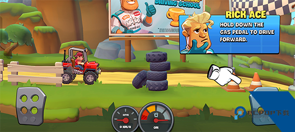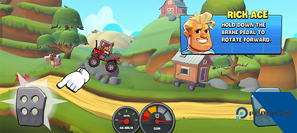3、左下角的刹车键除了用于减速,还能在飞跃坡道时控制车身旋转姿态,帮助玩家在空中稳住重心;