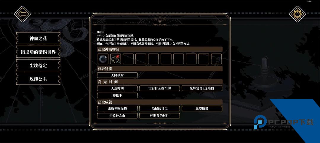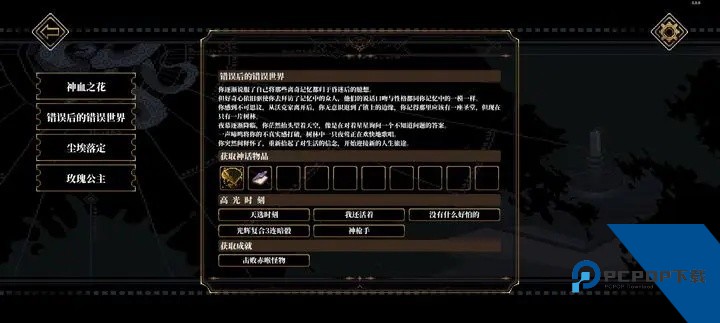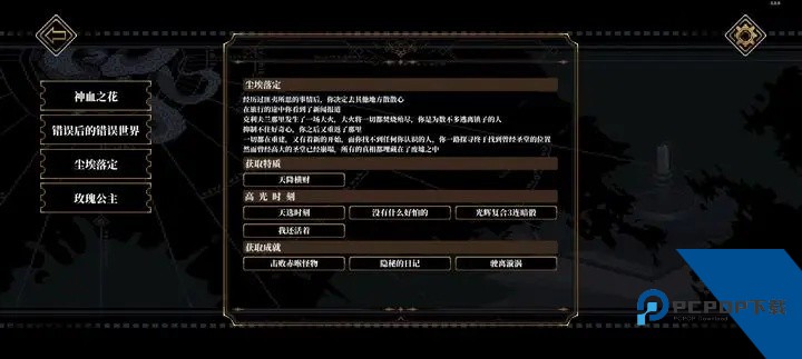 出来之后去右上角房间打怪获得一个线索,然后去右下角房间墓园拿,在桌子上拿到糖果线索,查看可以获得神话物品尸鬼教典。出来先找富商女儿对话,帮忙隐瞒,找富商对话,下毒,隐瞒他女儿的细节,出去被怪追上选上去帮忙打3个怪。躲箱子里躲过追来的三个人之后把门口的打了,进房间,把内脏拿了扔进血池,不要抵抗,然后就能见到哚哚了,顺便获得一个特质。先找哚哚对话,再分别触发头骨,蒲公英,触手的对话,选择留下来,和哚哚对话帮忙取下项链,打神之血获得神话物品血之花,从黑洞出去。注意不要碰到白色孢子,实在躲不过就用火点了再过去。去之前讲台暗道那里面,把主教和诺拉打了,之后出去找人分别对话完事走人触发结局玫瑰公主。