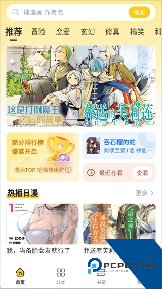 1.通过推荐、热门榜、分类专区挑选漫画,每一个专区都会不断更新。