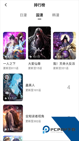进入排行榜页面,可切换日漫、国漫、韩漫分类,页面清晰展示各地区热门漫画的封面、人气值和更新话数,能帮你快速筛选出对应地区的高人气作品,精准找到口碑佳作。