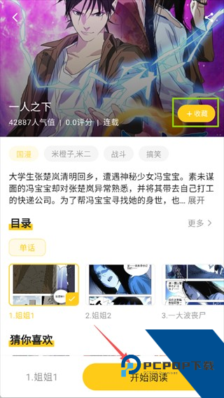 在漫画详情页,可查看作品人气、评分、题材标签和剧情简介,点击“+收藏”可将作品加入书架,目录区能快速定位具体章节,点击醒目的“开始阅读”按钮,即可直接进入所选章节的阅读界面。