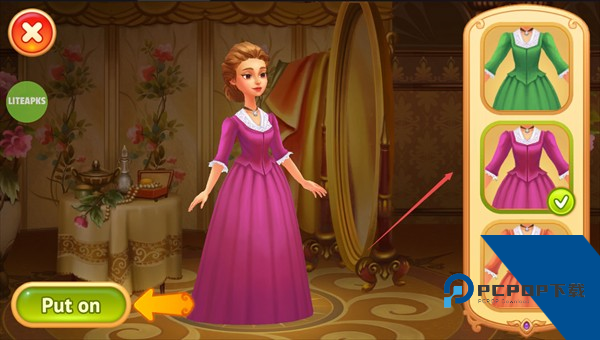 2、你可以选择不同的裙子来装扮角色,点击“put on”进行游戏