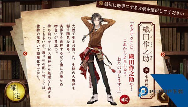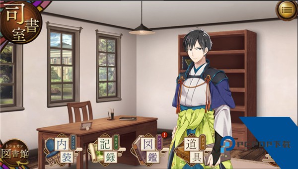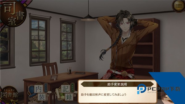 选完初始文豪开始进入图书馆界面,相当于刀男里的本丸,是游戏的开始界面,管理员的名字会自动使用DMM账号的名字,游戏里的按键和按钮都显示在画面上,点左上角可以隐藏按键,右边人物是助手,相当于刀男的近侍,近侍的更换后面司书室会讲,右上角的设置按钮可以调整声音大小,第一条ボイス是人物声音