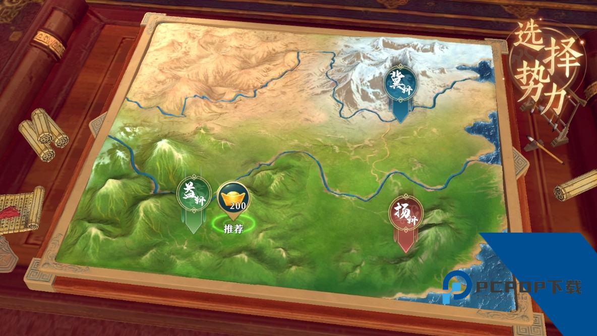 开局即选择国家,也称之为势力。益州=蜀国,位于西南;扬州=吴国,位于东南;冀州=魏国,位于北方。