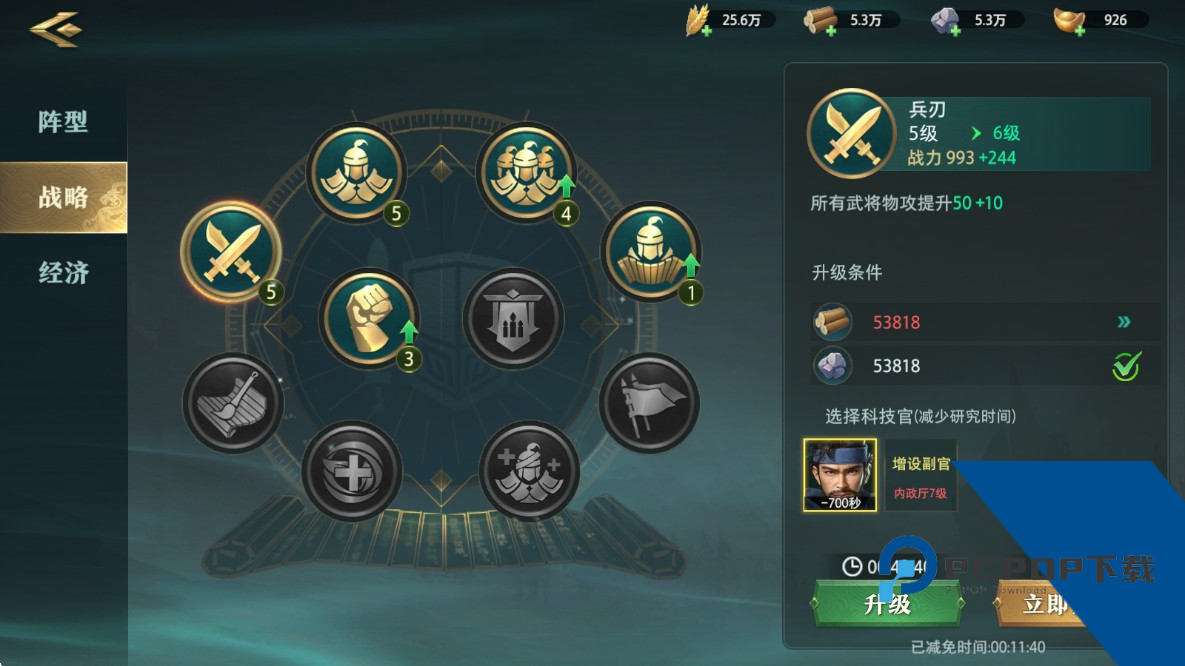 攻击类的科技选择一个升级就行,前期没那么多资源的,主要升级物防和物攻科技。防御科技稍微点一点就行。兵力科技也挺重要的,别忘了升级,阵型选择1个或2个重点升级就行。