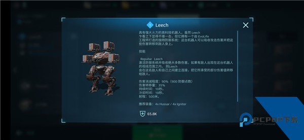 最后重点来了,水蛭,他的技能非常恶心,而且冷却时间较短,具体可以看图,它最大的亮点就是开启技能会得到90%的伤害减免,而且会反弹35%的伤害给链接的那个对手,武器配置方面,说难也不难,说简单也不简单,在中低端局,用四个中加特林(就是攻击距离500那个)升到九级就差不多了,不过他还有一个缺点,那就是血量过少。(适合中高端局)最近要出蝎子,这个东西非常恶心,尤其克制这种等技能的机器人,具体我就不剧透了,因为他还有可能改,以上就是我的推荐了。