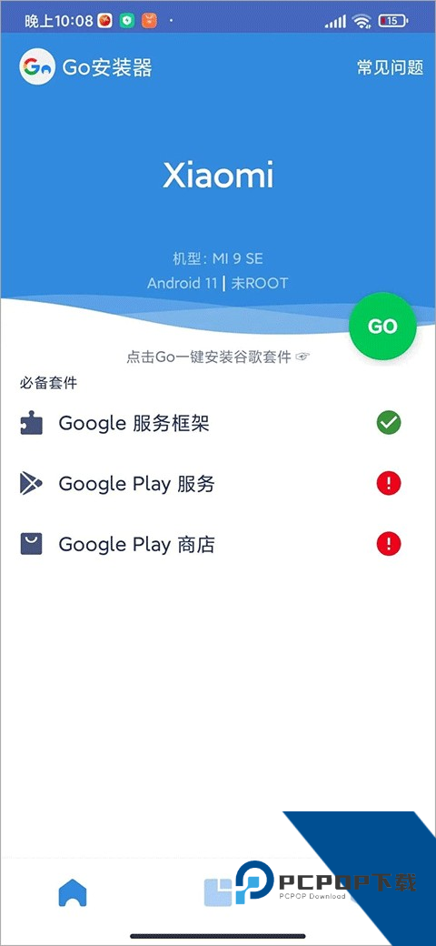 2、进入软件后,只需要点击右方绿色圆圈Go,就开始检查并安装适合该手机的谷歌三件套