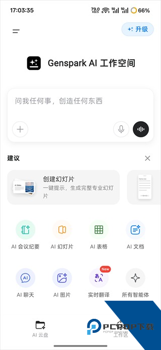 1、在注册登录软件后可以在聊天框中直接输入制作PPT的需求,也可以点击下方AI幻灯片进入专业PPT模式。