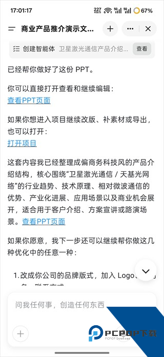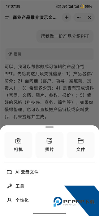 3、接着在聊天框中输入我们的需求,比如做一份产品介绍PPT。