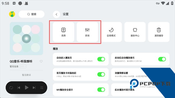 2、如果你感觉音质不满意,点击右上角的【设置】在点击【音效、音质】