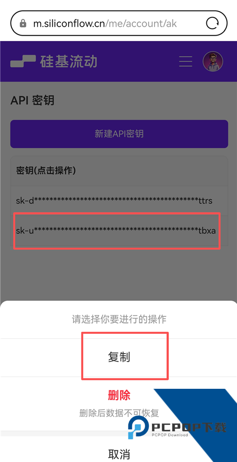 5、点击刚刚新建的密钥,选择【复制】。