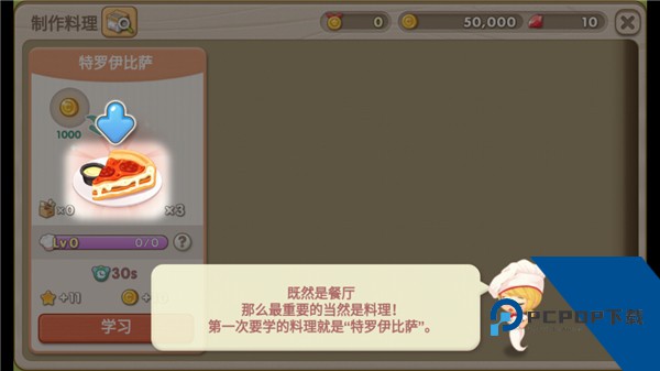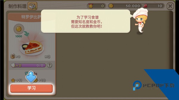 6、点击“学习”按钮,花费金币购买披萨的制作食谱。