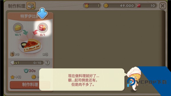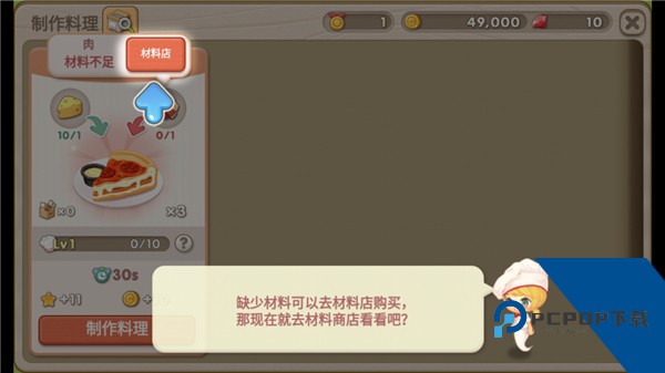 7、食谱学会后,进入制作阶段,但发现所需的食材还不够,点击“缺少的材料”进行补充。